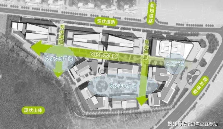 露天演艺剧场与建筑院落围合成中心庭院,与艺术长廊、艺术品展示大厅,为文化艺术创作提供碰撞、交流的自然舞台与开放场所,增加园区内的户外交流场所。