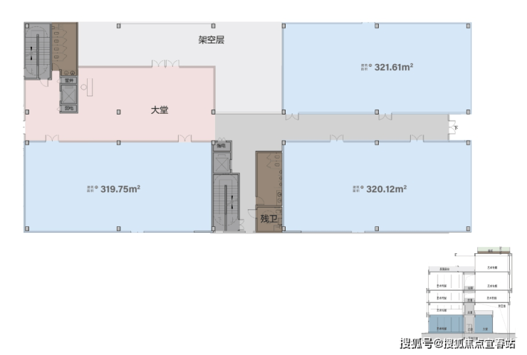 首层架空层顶层花园,提供良好的入口空间和休憩场所,将绿色引入建筑竖向空间。