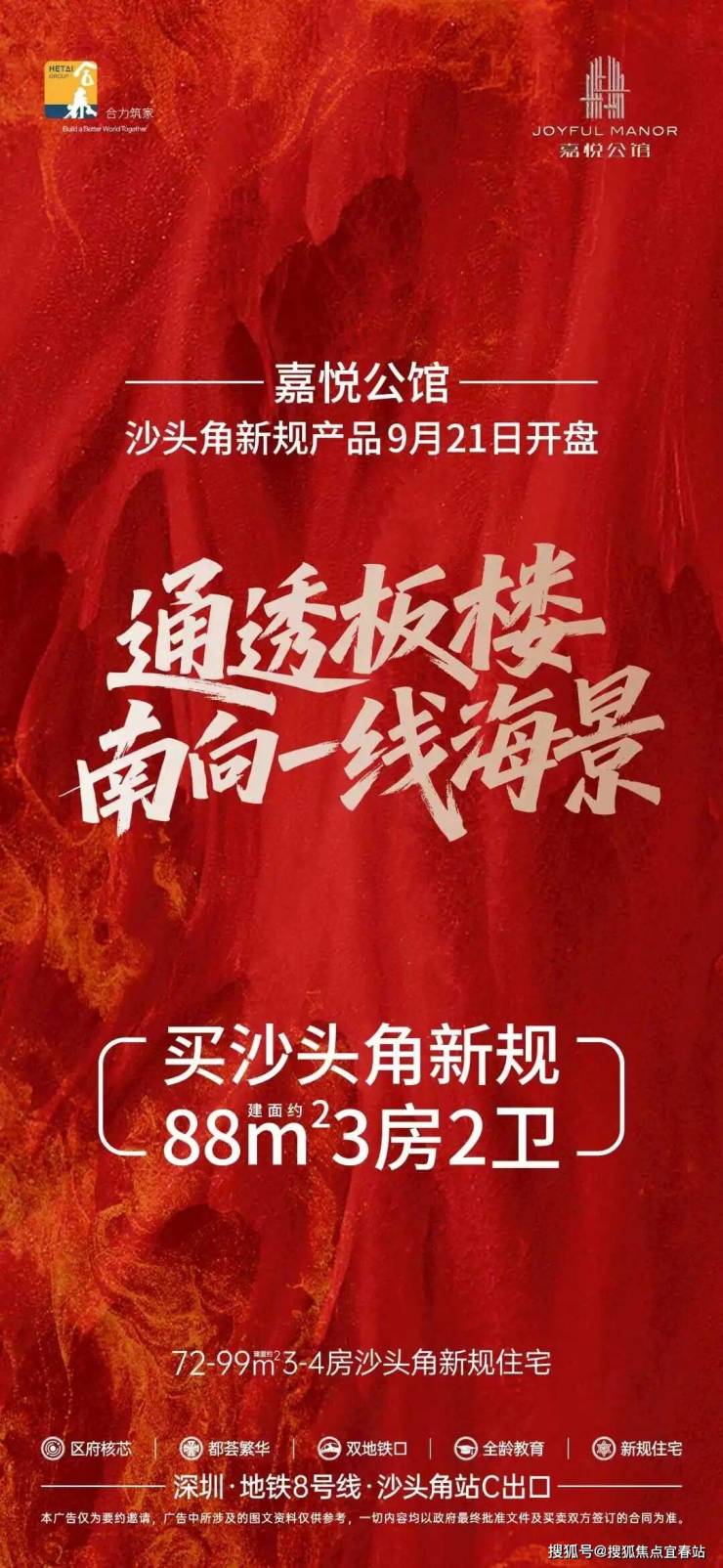 深圳合泰·嘉悦公馆位于盐田沙头角,近地铁8号线沙头角站。背靠梧桐山,南眺大鹏湾,景观优越。户型为72-99㎡三至四房,新规住宅得房率高,周边教育、商业配套完善,是刚需与改善型购房者的优质选择。