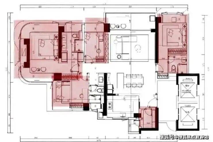 单元楼近1:1梯户比,分区设置电梯厅,类似于华润城润玺,北区大户型双电梯独立电梯厅入户,南区3梯4户
