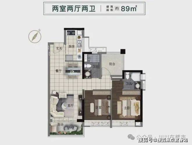 89㎡户型三开间朝南,南向望园林,独享阳光景观,主卧套房设计,更具私密性。