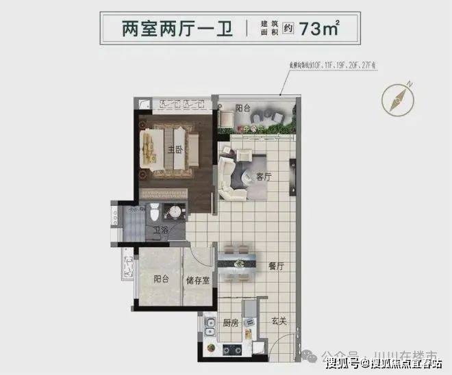 建面约73㎡的江景两室,是目前项目最受欢迎的户型,也是适合刚需客群的选择。亮点一:U型厨房,可与餐厅打通,变成时下火热的“社交厨房”。亮点二:户型灵活多变,阳台可改灵动空间,单身时作为独立收藏室,成家后又可多一间卧室。亮点三:阳台、主卧,前方视野辽阔,可以直接望见珠江支流景观。亮点四:小面积低总价,低门槛+大景观,注定了这个户型将成为爆款。