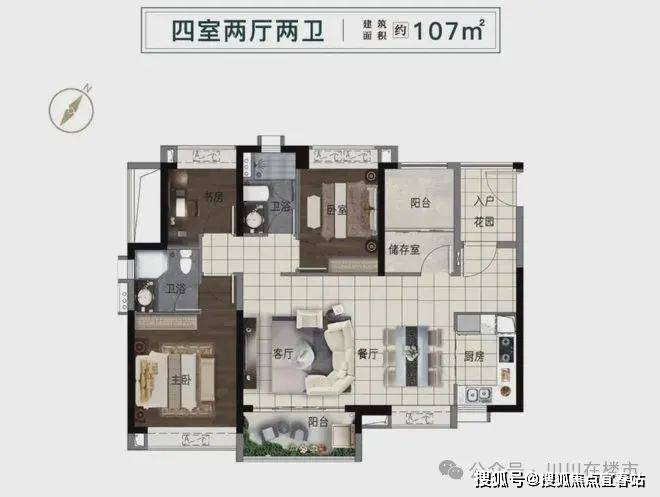 107㎡户型则是横厅设计,四开间朝南,两处灵动空间,可以灵活打造满足不同居住需求。书房、卧室、主卧、餐厅都带飘窗,解决收纳难题。