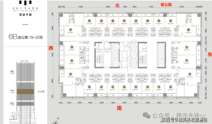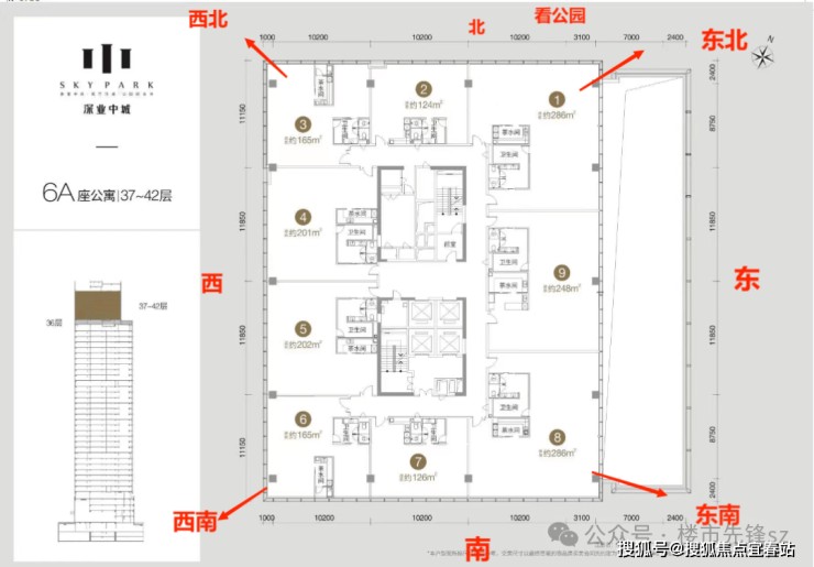 深业中城建面约36 万㎡,包括写字楼、商业、公寓、住宅、幼儿园等7栋建筑物,是香蜜湖板块城市综合体标杆物业。其中6A栋为6-35层为办公产品,37-42层是公寓,公寓面积段为120-282㎡共60套。6B栋6-9楼为酒店,10-42层为公寓,户型面积段以中小面积为主,面积区间为46-113㎡