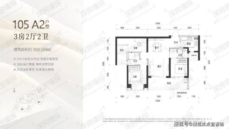 103-104㎡的3房2厅2卫,A2户型(2栋4单元/3栋2单元03户型),设计的是竖厅类双龙抱珠格局,客厅3.6米开间,客餐厅一体化设计,3个卧室分别做到了主卧12.8㎡/次卧12㎡/次卧8.7㎡(包含墙体飘窗),客厅连接次卧出6.5米长的宽景大阳台,U型厨房,公卫三段式分离,得房率约90%(包含赠送),正南朝向。跟A1户型除了朝向不一样,其它都是一致的。