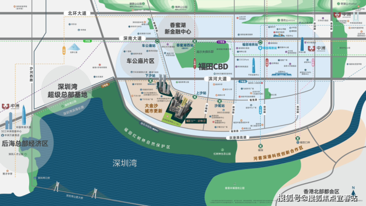 超300亿大金沙规划,唯一接驳福田CBD和深圳湾的滨海新城,北邻香蜜湖新金融中心和车公庙2049未来之城,南接河套深港科创合作区,以政府资源的倾斜和前瞻的规划,成为最具生长力片区,主推福田CAZ转型。