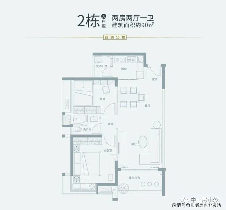 01户型:90㎡,2房2厅1卫(南,售罄)