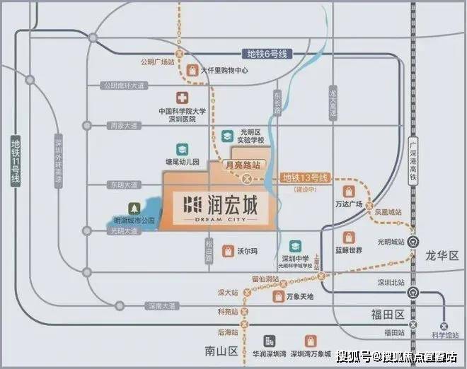 片区更新单元有轨道快线13号线,13号线月亮路站的TOD大城。从月亮路站出发,1站即达凤凰城站,在此处换乘6号线,可便捷通达福田中心;3站即到轨道枢纽光明城站,搭乘高铁,可快速直达深圳北、福田。