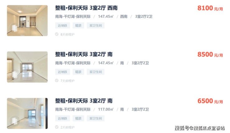 在贝壳上,保利天际一套三室两厅,就可以租6500-8500元/月,收益轻松跑赢大市。