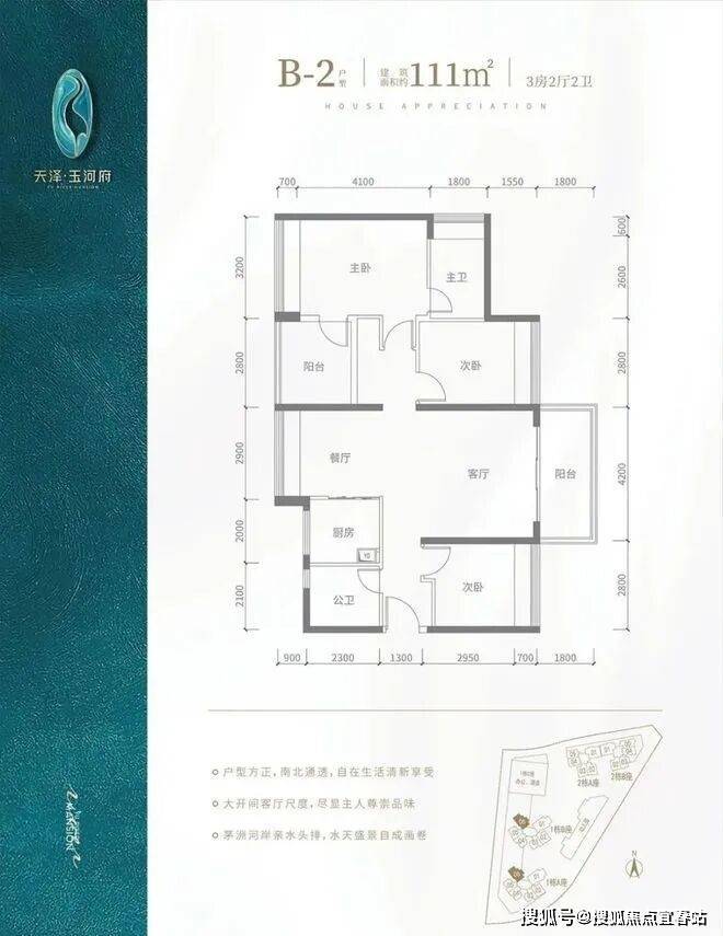 B2户型-111㎡-4房2厅2卫,设计的是竖厅南北通透格局,客厅4.2米开间,阳台主朝东北朝向,看花园景观,全屋飘窗设计。