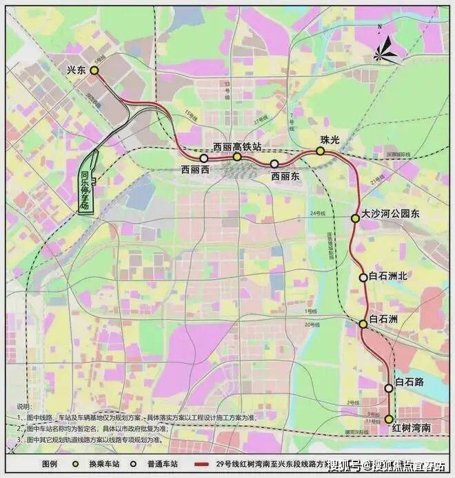 29号地铁线:该线路为南山至光明的普速线路,主要功能为带动沿线城市组团重点片区高质量发展,设计时速80公里,共分2期开发,其中1期兴东-红树湾站已经动工,共设站10座,全线长约11.3公里,建设周期为2023-12-30至2028-12-28;2期是途径石岩,终至科学公园站。
