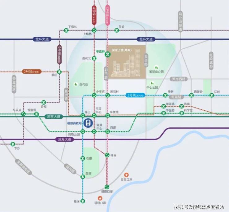 无缝接驳地铁10号线冬瓜岭站,纵享福田“一中枢、双口岸、四核心”枢纽体系,再造引桥匝道升级微循交通体系,高效互联湾区城市与全球资本。