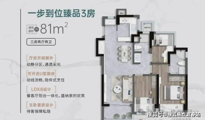 81㎡的3房2厅2卫,设计的是竖厅格局,客厅3.05米开间,LDKB一体化,S墙设计预留冰箱卡槽位,动静分区,U型厨房,卫生间三段式干湿分离还带1个设备平台,得房率约91%(包含赠送),实用面积约73.71m²,正东或正南朝向。