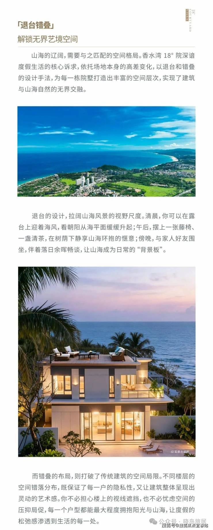 香水湾·十八度院,是盈新发展匠心布局海南香水湾的高端文旅地产作品序列。以26栋退台设计叠拼院墅规划,坐拥约7公里原生海岸,约200米一线亲海而居,临河而立、面朝岛屿、背靠热带山脉。遵循北纬18°宜居灵感,进行天人合一·自然共生·因地制宜的院落打造,致力于打造代表世界陵水人居品位的一线亲海臻稀叠院,成为兼具自然私密与奢逸舒适的身心留地,更是自贸港珍珠海岸上的山海孤品院墅。