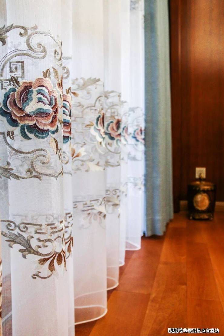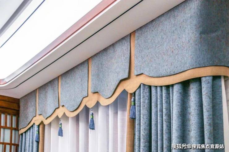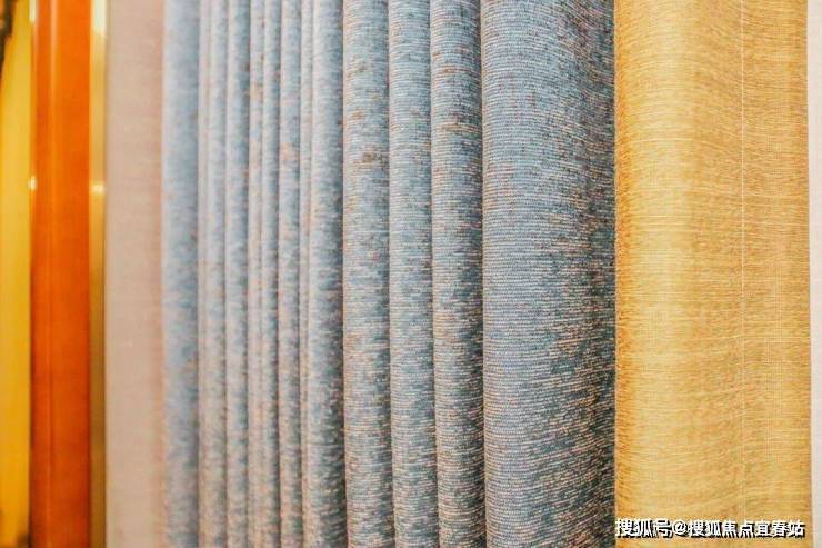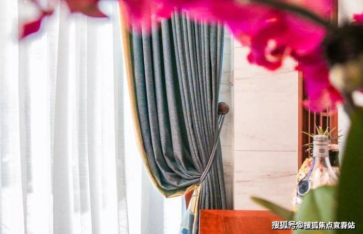 在客厅窗帘颜色的搭配上选择与沙发坐垫和沙发背景的屏风色调一致,配布则用明黄色来提亮点缀空间。蓝色亚麻质感的窗帘,带有一丝灵动,也丰富了空间层次。整体空间颜色种类不多,互相呼应,因此显得格外协调。