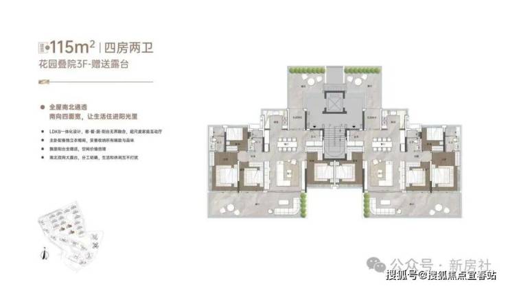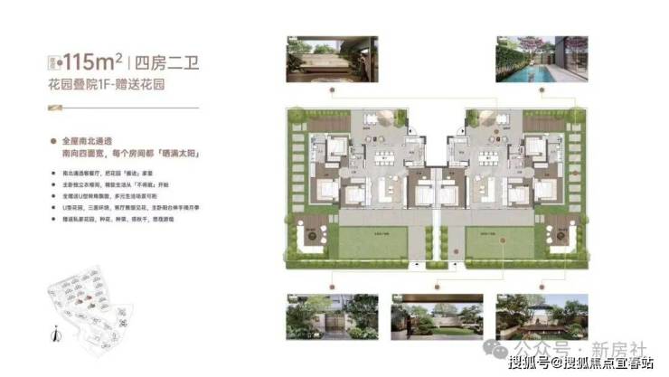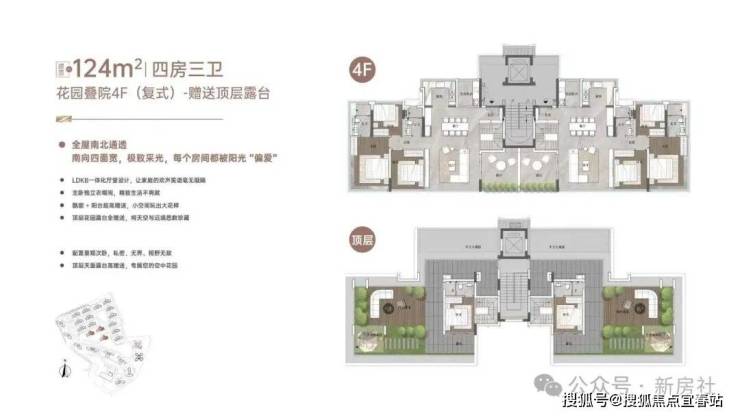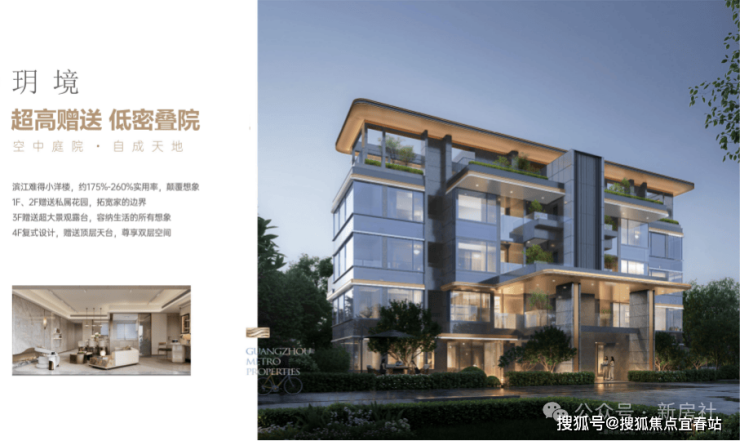 “玥境”为滨江小叠院,主打112-130㎡低密叠院,最大亮点是超高赠送率,1F、2F户型赠送私属花园,3F赠送超大景观露台,4F复式设计,赠送顶层天台。