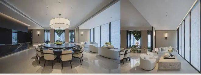 会所整体用材运用石材、木饰面、陶瓷等元素,还原材料本身的触感以及自然的舒适度,来打造东方典雅的空间。同时通过材质的延伸,呼应与建筑景观的一体性。