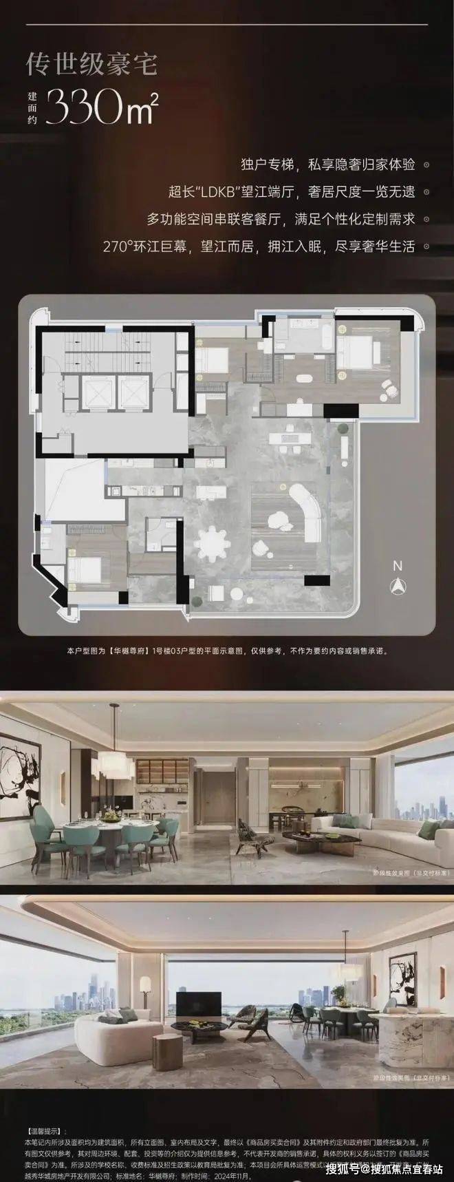 • 330㎡:端厅设计,270°江景视野,主卧配备270°飘窗,奢享私密性。