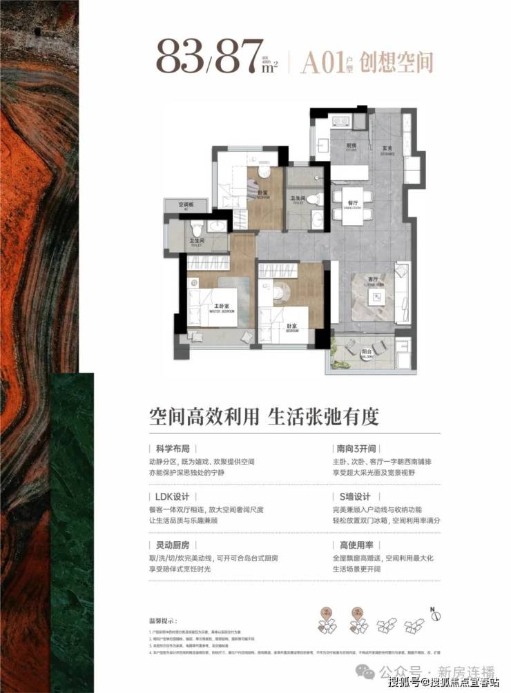 83-87平:3房2厅2卫,套内净使用率在80%,西南朝向