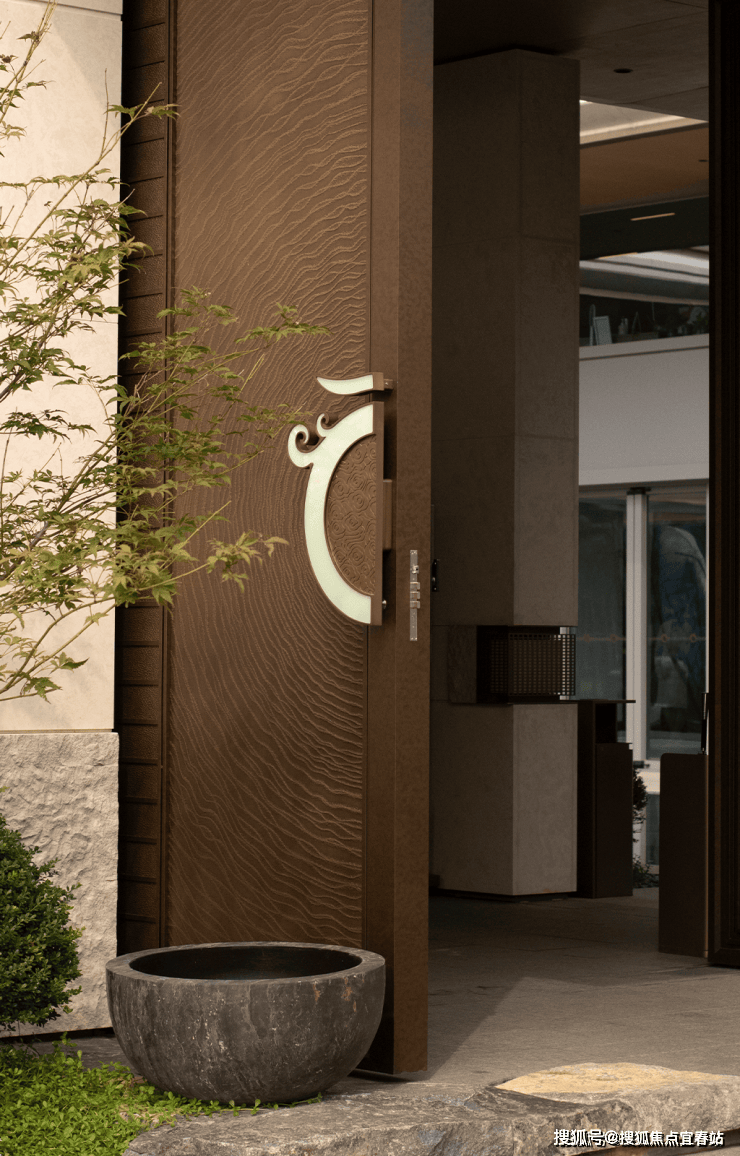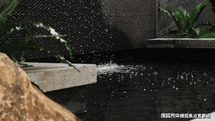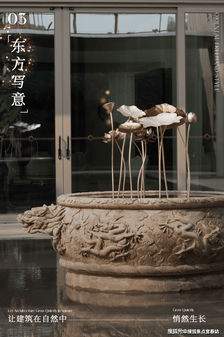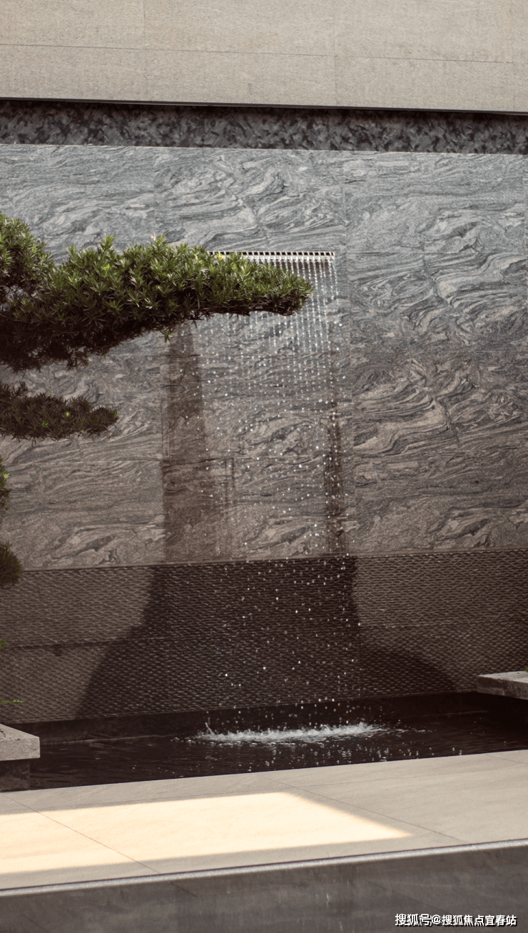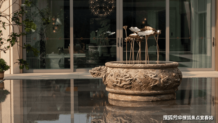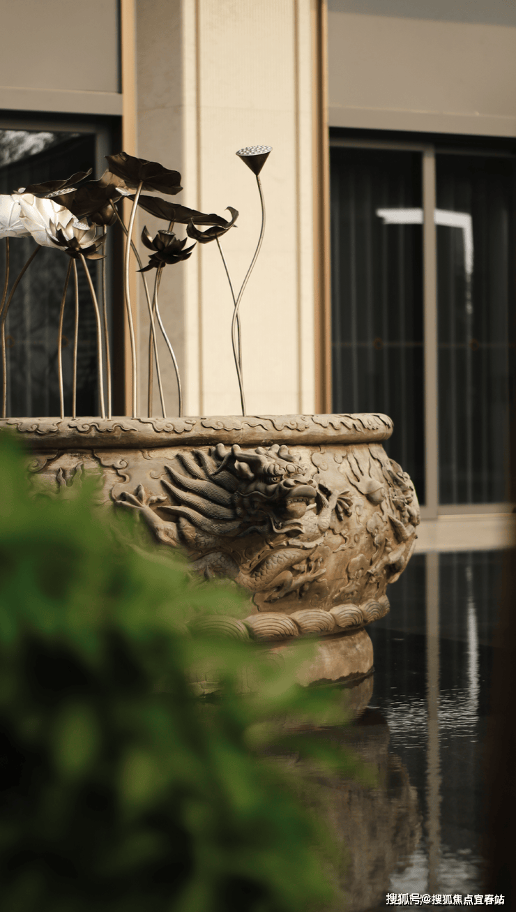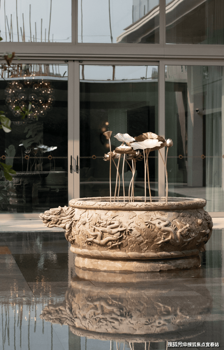 大理石墙下,细水从金属槽口成帘幕坠落,一侧造型黑松姿态苍劲,“动水的清脆”与“静松的苍古”交织,都让建筑仿佛从土地中自然生长而出。古朴石缸与现代金属荷花的碰撞、墙面艺术与镜面水庭的虚实互动,这些“古意新造” 的笔触,在动与静、传统与现代之间,勾勒出独特的空间气韵。这不仅是一种审美,更是一种融入日常的、宁静致远的生活境界。