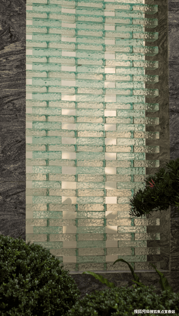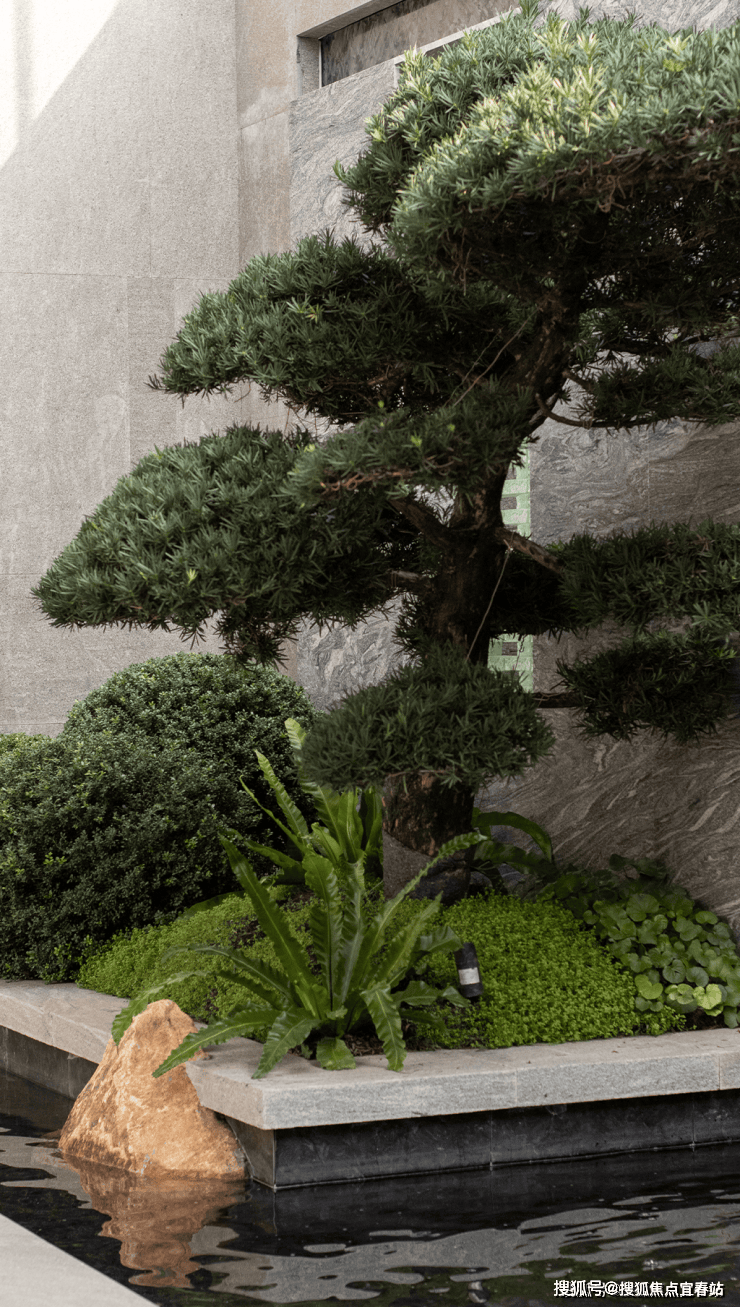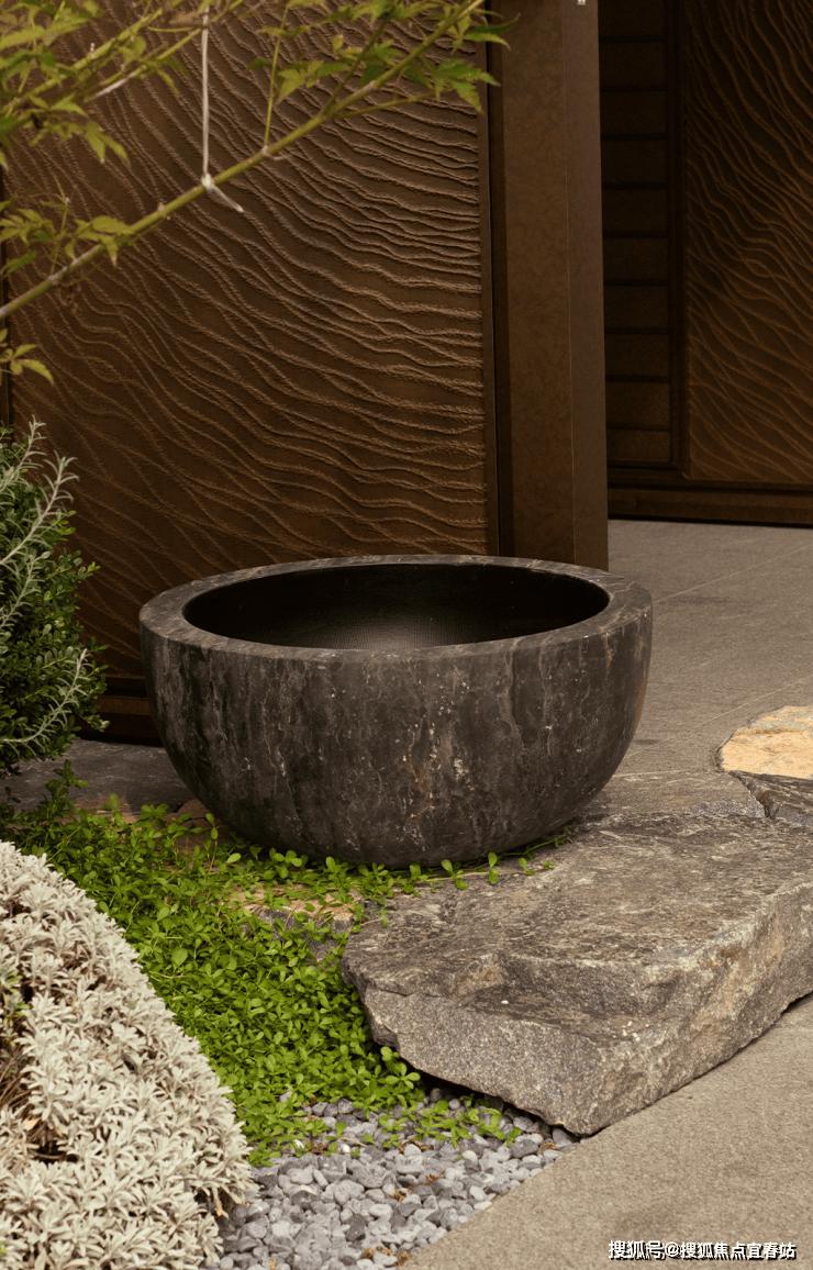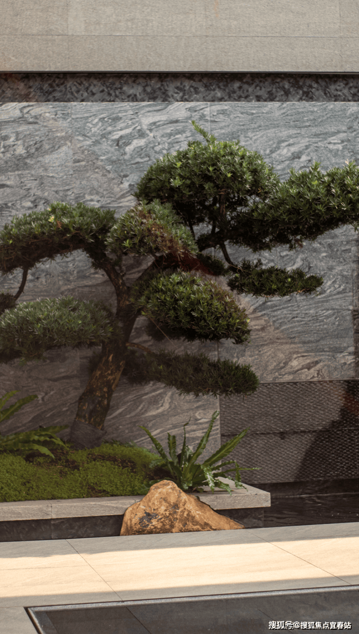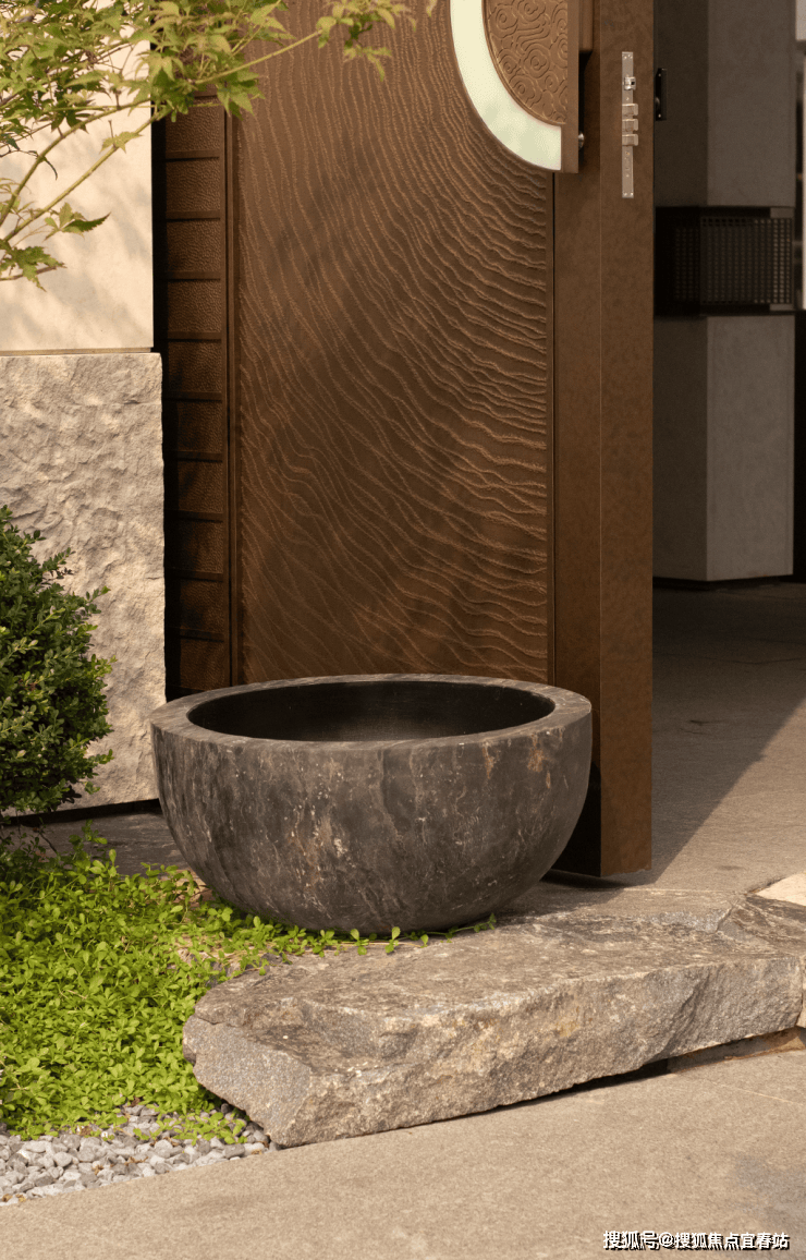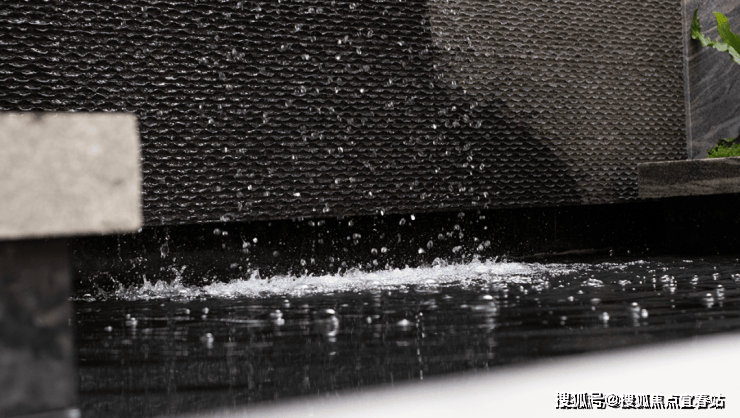 大理石墙下,细水从金属槽口成帘幕坠落,一侧造型黑松姿态苍劲,“动水的清脆”与“静松的苍古”交织,都让建筑仿佛从土地中自然生长而出。古朴石缸与现代金属荷花的碰撞、墙面艺术与镜面水庭的虚实互动,这些“古意新造” 的笔触,在动与静、传统与现代之间,勾勒出独特的空间气韵。这不仅是一种审美,更是一种融入日常的、宁静致远的生活境界。