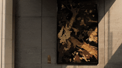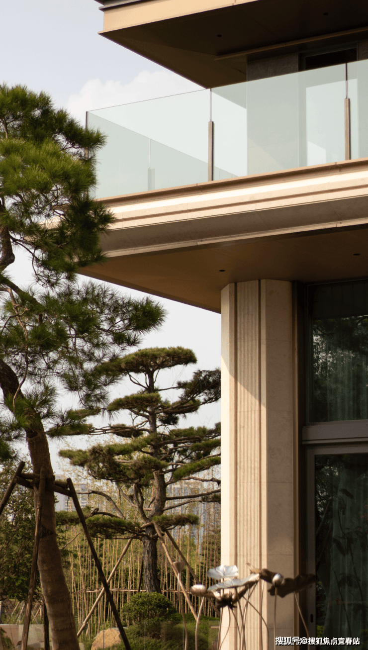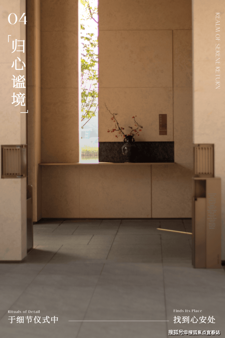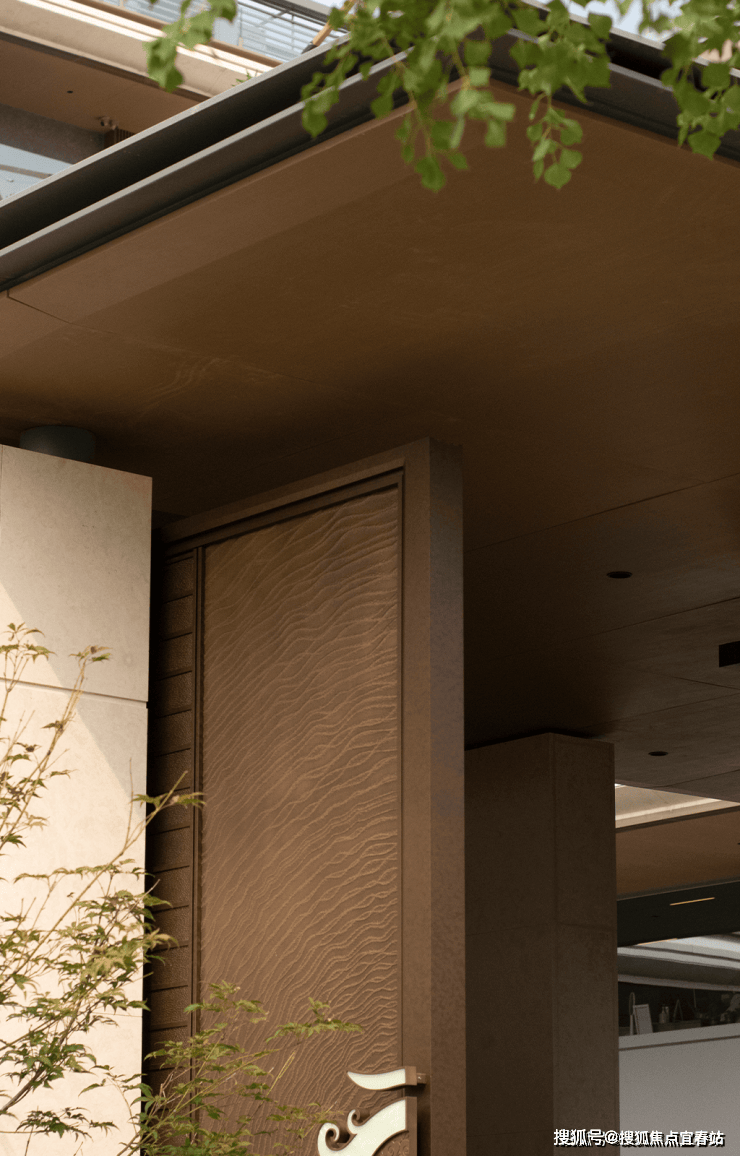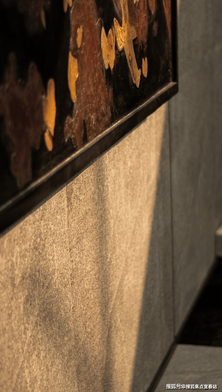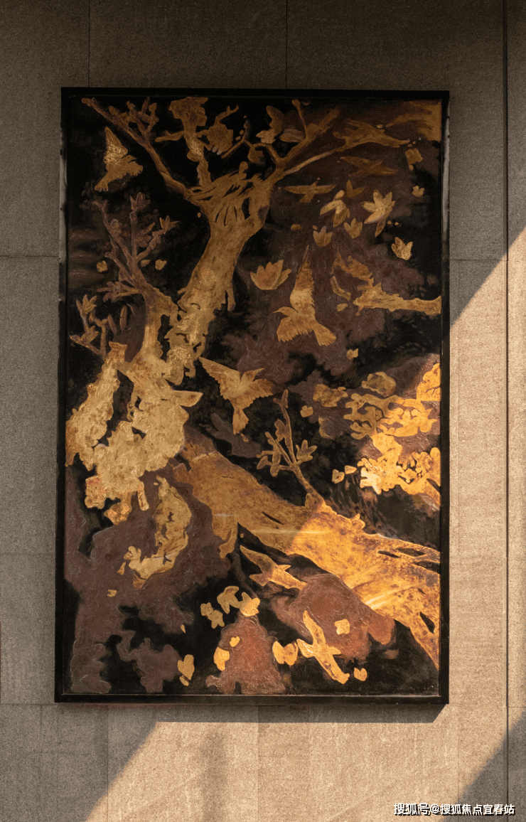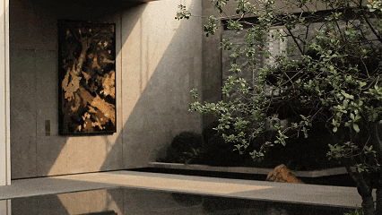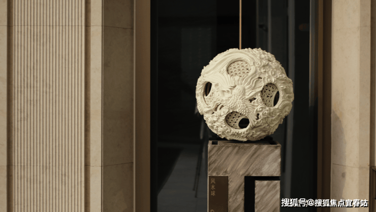 大理石墙下,细水从金属槽口成帘幕坠落,一侧造型黑松姿态苍劲,“动水的清脆”与“静松的苍古”交织,都让建筑仿佛从土地中自然生长而出。古朴石缸与现代金属荷花的碰撞、墙面艺术与镜面水庭的虚实互动,这些“古意新造” 的笔触,在动与静、传统与现代之间,勾勒出独特的空间气韵。这不仅是一种审美,更是一种融入日常的、宁静致远的生活境界。
