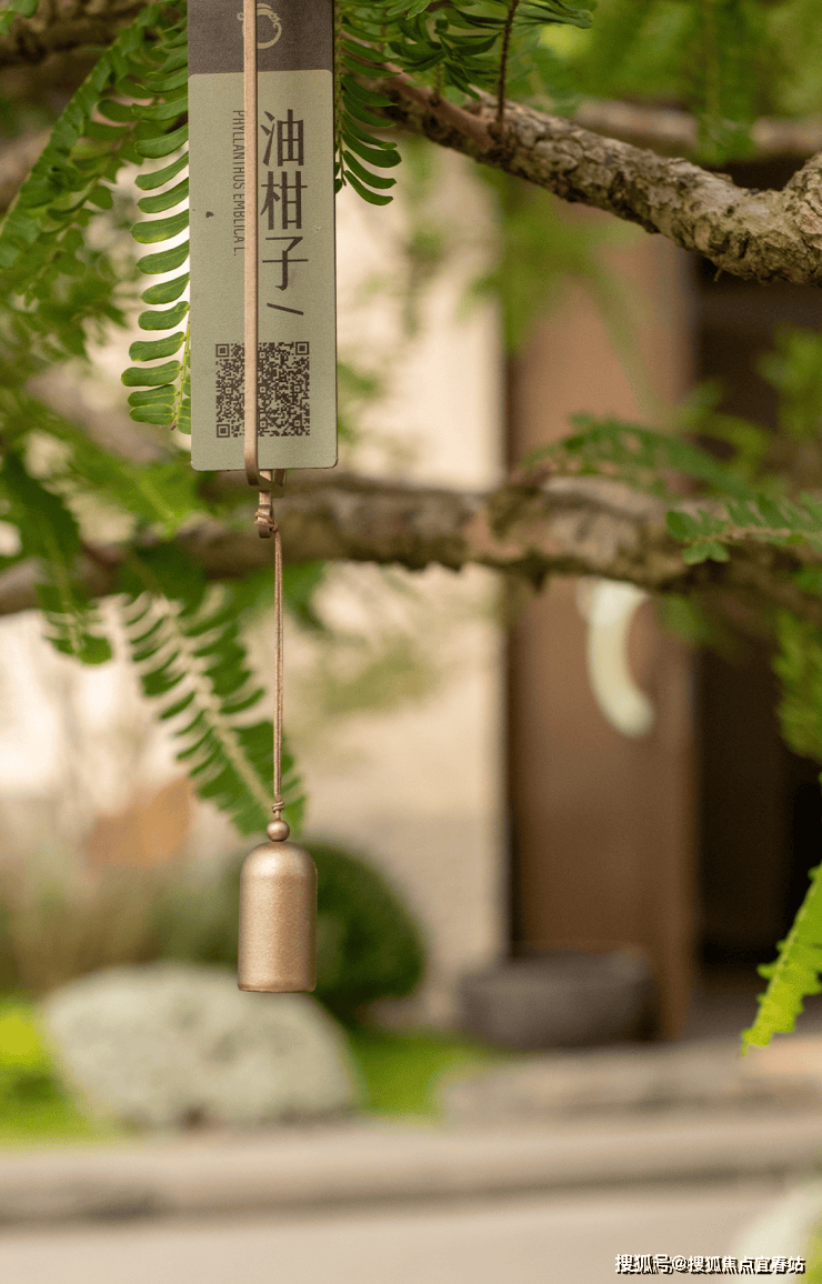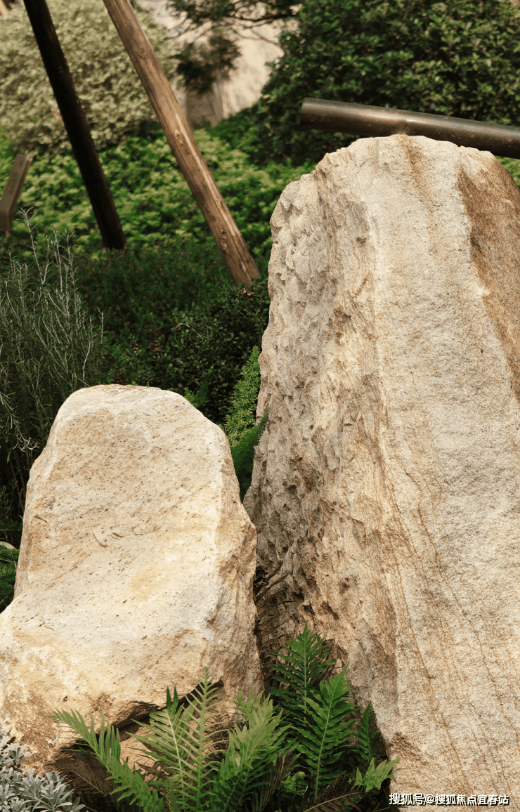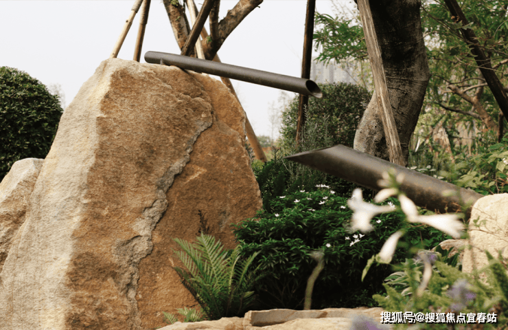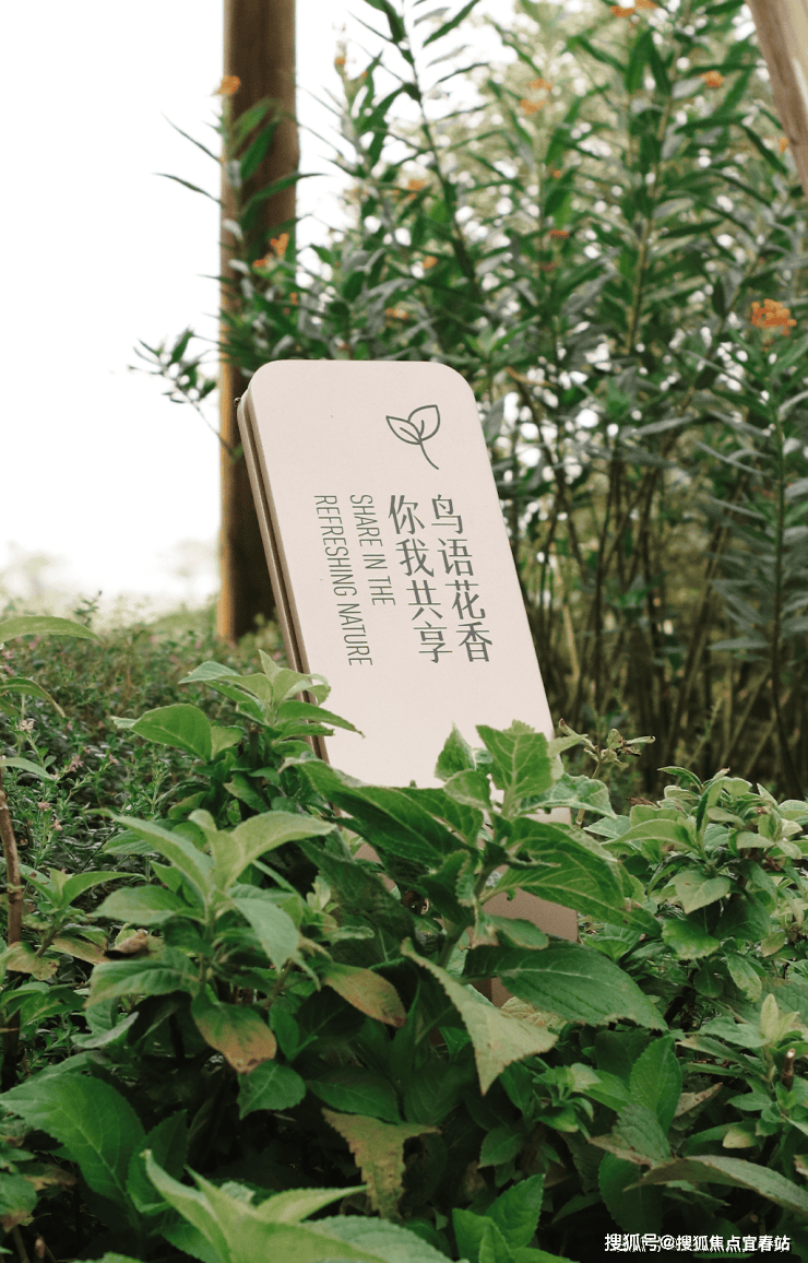 原生巨石与舒展的树木共生,还原了“石之朴、木之秀”的自然野趣。树枝间悬挂的植物标识风铃,微风拂过,清音入耳,是自然最动听的问候。而那句“鸟语花香,你我共享”的提示,则温柔地传递着 “人与自然共融” 的社区理念。这是一个充满生机与趣味的探索空间,唤醒您对生活本真的感知。