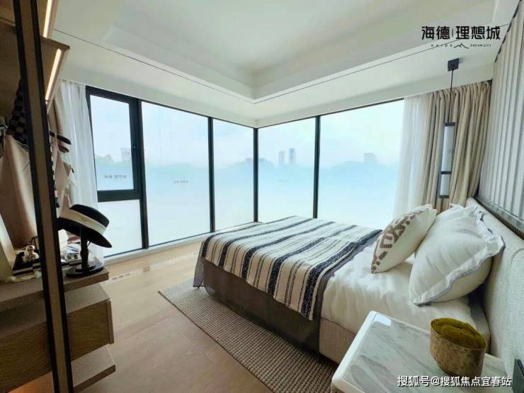 连卧室的270°观景飘窗,都是IMAX视野。很多新规户型主卧转角处有柱子阻碍视野,海德理想城得益于外立面的无柱转角设计,飘窗转角处也是玻璃,以接近全面屏效果,将窗外之景与窗内之境完美融合,日光摇曳,树影斑驳,氛围怡然。
