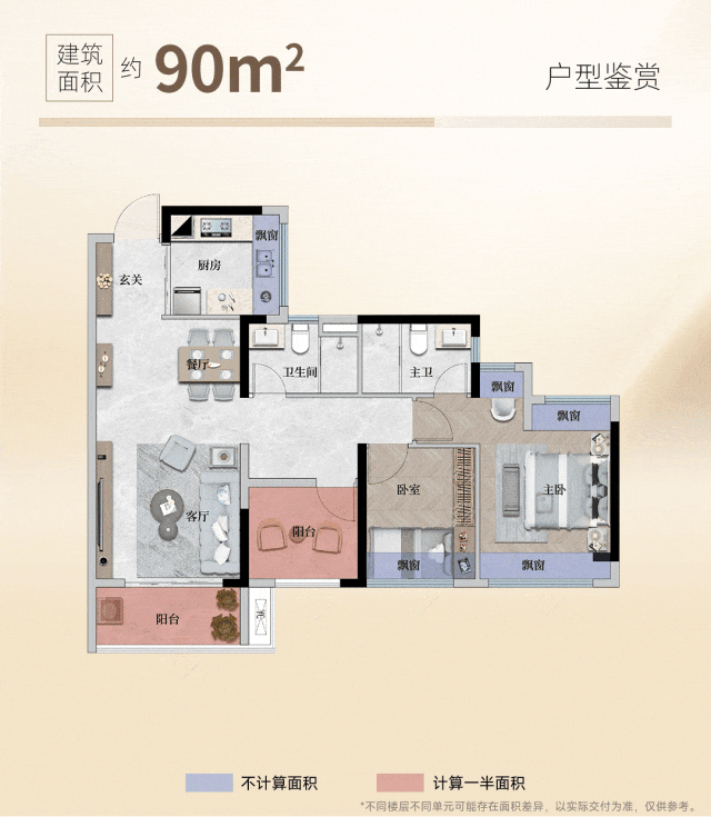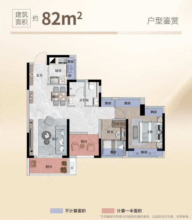 建面约82㎡户型实现四开间朝南,创新1.5卫设计,主卧三飘窗,通透性和使用率大大提高。
