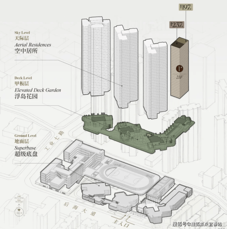 招商玺在建筑设计上采用了创新的“浮岛甲板"策略,四栋住宅落于甲板之上,独享甲板庭院花园,进而形成超级社区底盘+浮岛绿化甲板的垂直共生人居标杆。