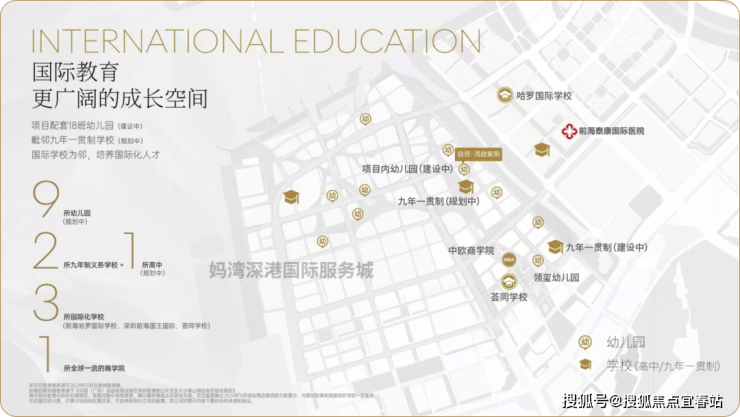 学校:『湾啟紫荆府』项目自身配建有一所18班幼儿园,南侧紧邻一所36班九年制学校,东侧隔前湾公园是哈罗国际学校;1公里范围内还分布有南二外妈湾学校、南二外前湾学校、荟同国际学校;根据法定图则,除了上述学校外,妈湾未来还将新增至少两所72班九年制学校。