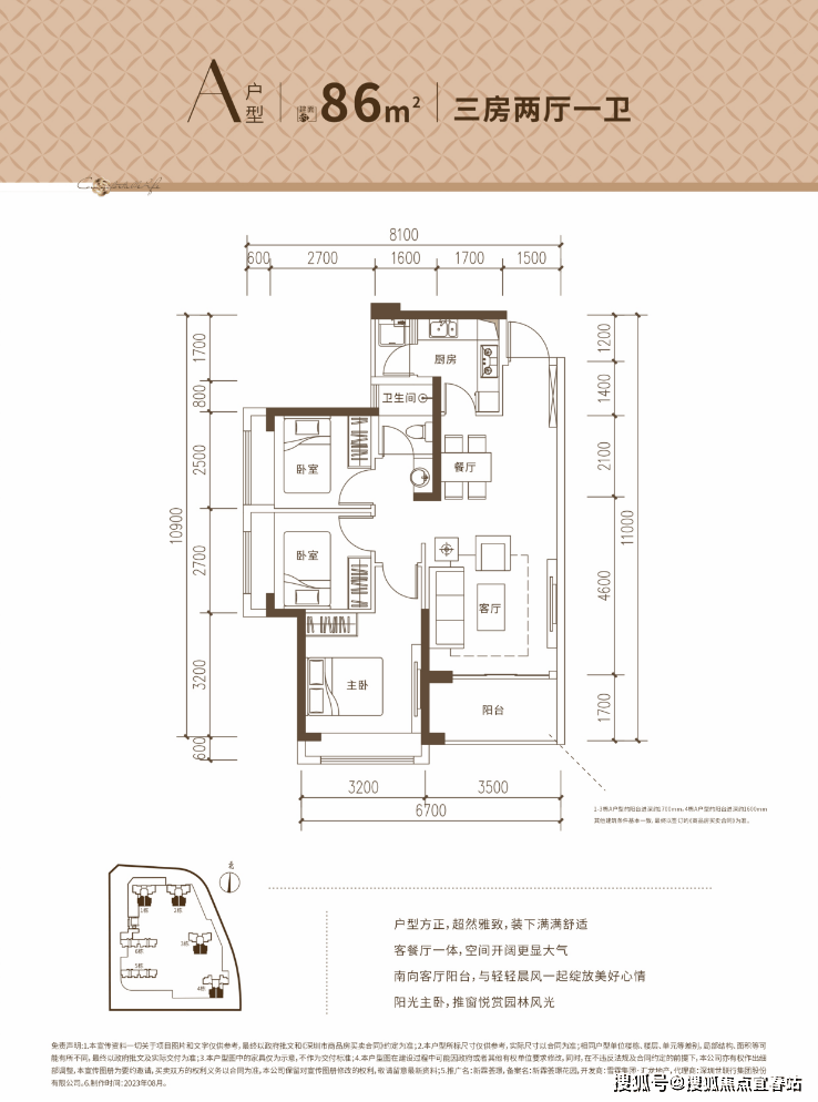 86㎡的3房2厅1卫,设计的竖厅格局,客厅3.5米开间,L型厨房,卫生间三段式分离,正南朝向。