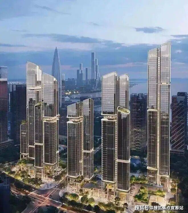后海沄玺花园旨在打造城市次地标,设计灵感来自植物细胞的有机形态。项目由五座150-250米塔楼组成,采用错落布局和平面退台设计,以优化深圳湾景观视野。
