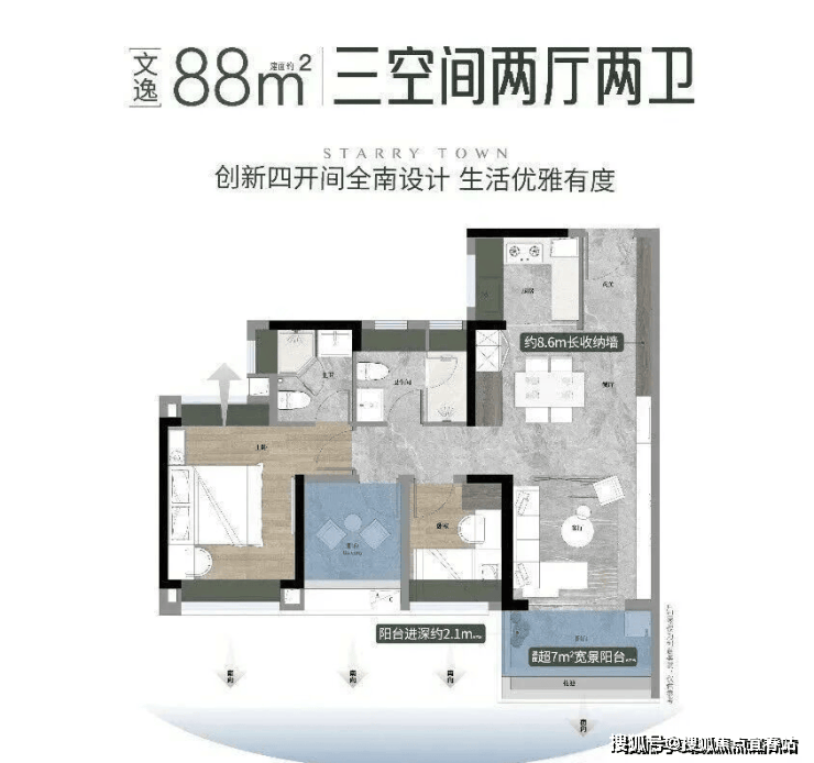 【88㎡ 3空间2厅2卫】罕见四面宽小户型,朝南居家生活。三卧室朝南,超11米景观线,与阳光无限亲近。精细化收纳,约10米收纳墙,藏纳全家人的爱好。