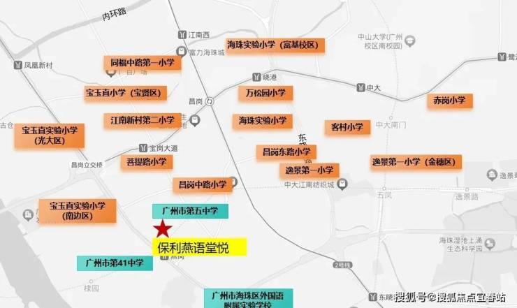 工业大道中小学、广州市第41中学、广州市第5中学、广州昌岗中路小学(翠城校区)、广州市海珠外国语实验中学附属学校、红棉小学(顺意小区)、海富小学、南燕小学、宝玉直小学(南边路校区)