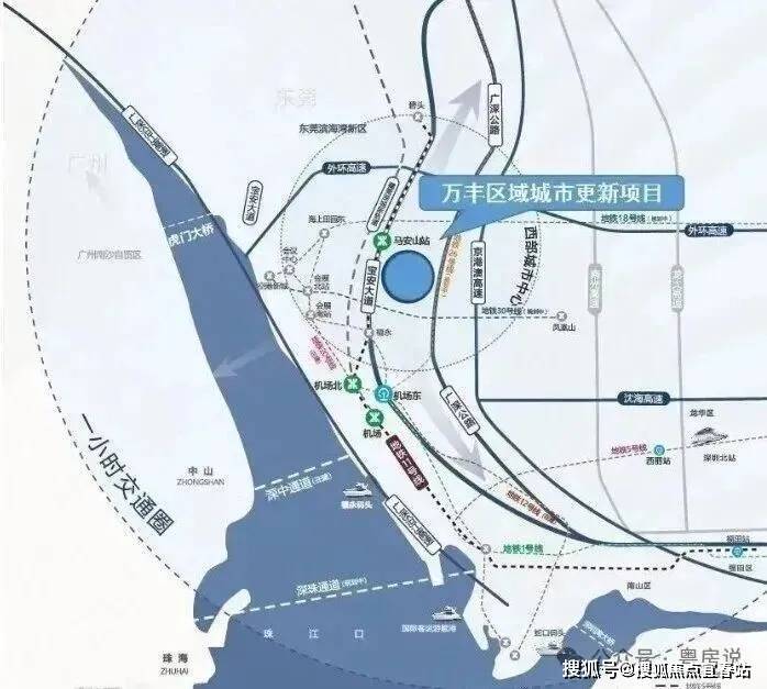从宝安机场客运码头出发,可以到达香港、澳门、广州、珠海、中山5座城市。陆路交通已经形成“两横三纵”,“两横”是项目南北两侧的南环路、新沙路,“三纵”是项目西侧宝安大道、东侧中心路和107国道。高速方面拥有“四大高速”,广深高速、京港澳高速、广深沿江高速、外环高速等。深中通道预计2024年建成通车。