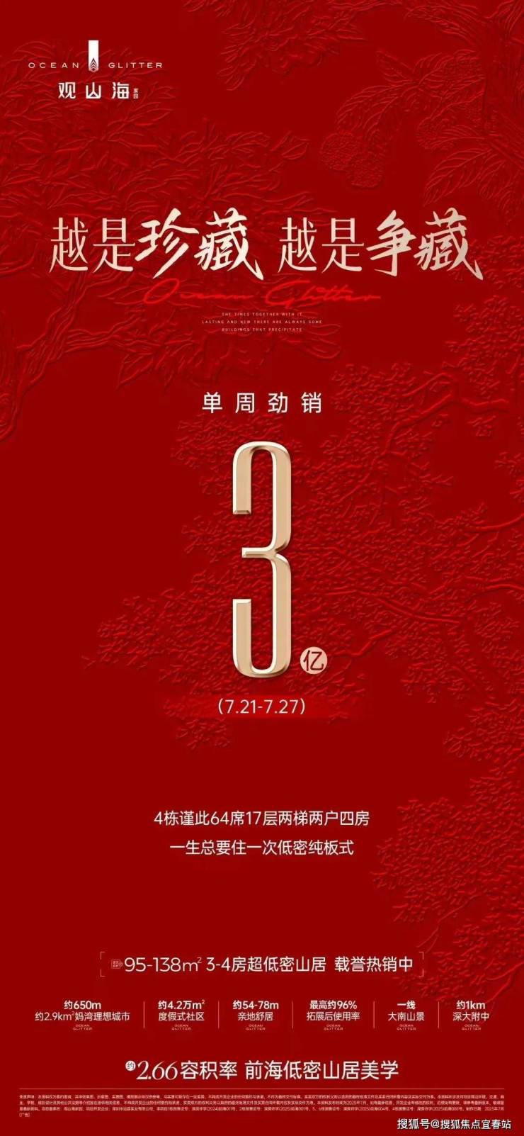 观山海项目最后的楼王,138㎡大四房,2梯2户,独门独户,总层高只有17层,看山景,已正式发售,单周劲销约3亿