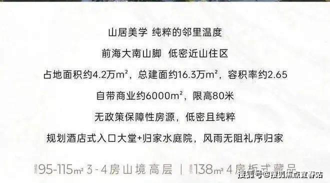 南山前海观山海一举冲上深圳上半年成交榜前三名,最近成交最火项目之一,深圳罕有2.66容积率,超底密山居,自带强势吸粉力!面积95-108-110-113㎡,单价7.6-8.2万/㎡,总价738-1020万