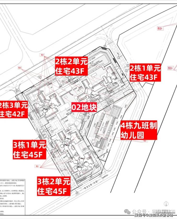 02地块:总占地面积约1.78万㎡,总建筑面积约19.7万㎡,计容建筑面积约13.7万㎡,容积率7.71,绿化率30%,共由5栋42-45层高住宅组成,分别是2栋1/2单元住宅43层,2栋3单元住宅42层,3栋1/2单元住宅45层,4栋配建1所9班幼儿园。