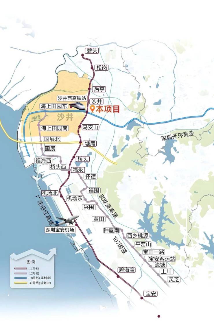 项目占位宝安沙井核心枢纽,近享地铁 11 号线沙井站,步行可达,快速衔接宝中、前海、福田等核心板块。周边毗邻宝安大道、外环高速等城市主干道,自驾出行高效便捷。同时可快速通达深圳国际会展中心、宝安国际机场,形成 “地铁 + 主干道 + 空港” 多维立体交通网络,无论是日常通勤、跨区出行还是商务往来,都能实现高效通达,区位交通优势十分突出。