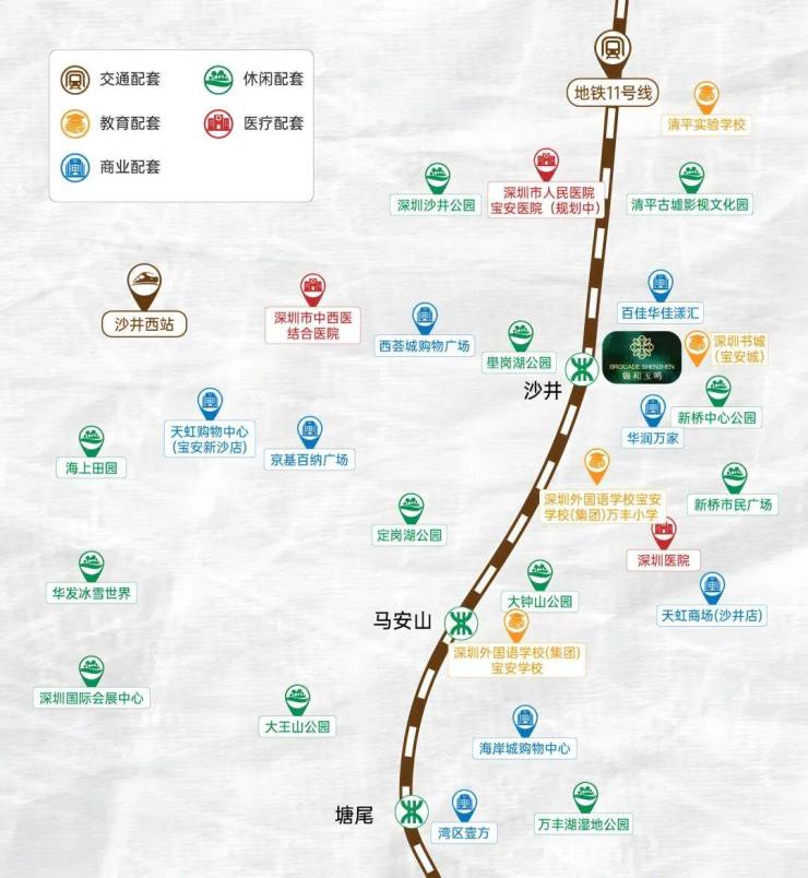 项目占位宝安沙井新桥核心,踞大前海、大空港、会展新城、海洋新城四大战略区几何中心,承接西部发展红利。距地铁 11 号线沙井站仅约 400 米,步行 7 分钟直达,8 站抵宝中、10 站达前海,快速串联全城核心。周边百佳华佳漾汇、万丰海岸城、山姆会员店等商业环伺,3 公里内覆盖 24 个商场,生活便捷度拉满。教育上属深圳外国语学校宝安学校共享学区,配建 9 班公立幼儿园,护航全龄教育。
