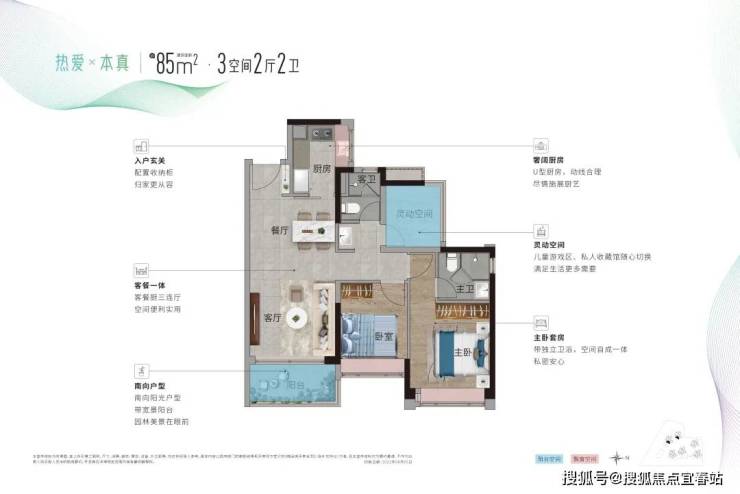 入户玄关、U型厨房、客餐厨三连厅、多功能灵动空间、卧室大飘窗等标配,这个户型通通都有,主客卫设计,相当新颖。