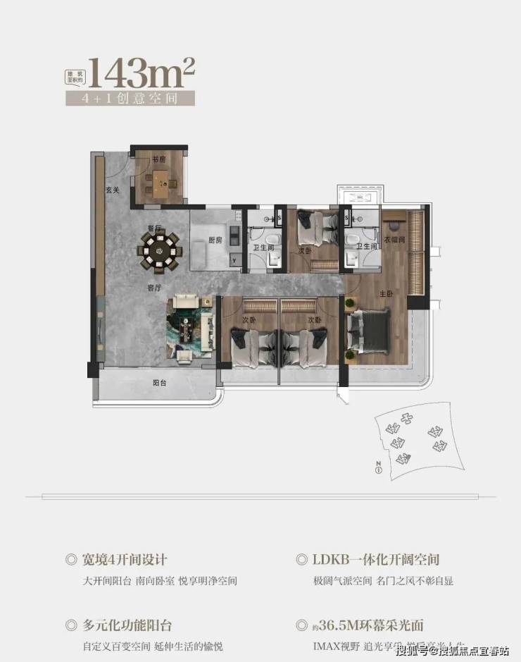 143㎡户型,南向宽景4开间设计 | 约36.5M环幕采光面 | 270°环幕瞰景主卧|多元化功能阳台