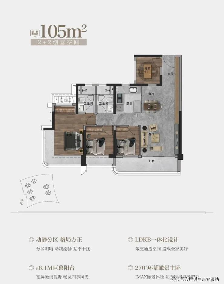105㎡户型,约6.1M巨幕阳台 | 270°环幕瞰景主卧|LDKB一体化设计