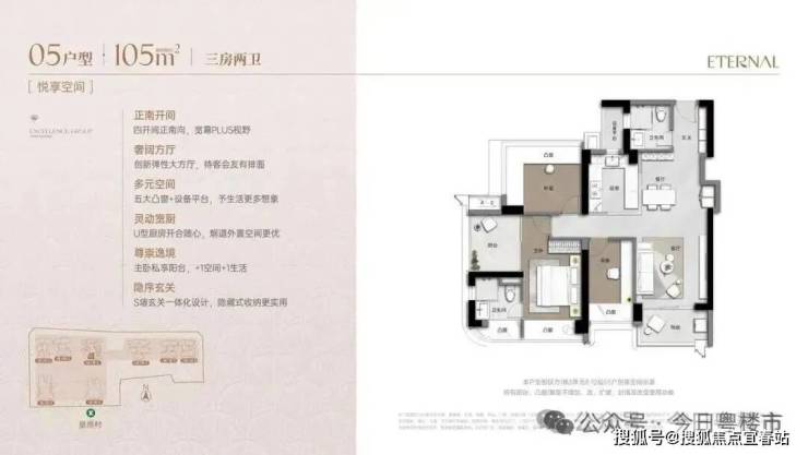 105㎡3+1房两厅:西南朝向可看花园,灵动“+1”房空间可灵活调整使用场景,满足家庭成长需求。