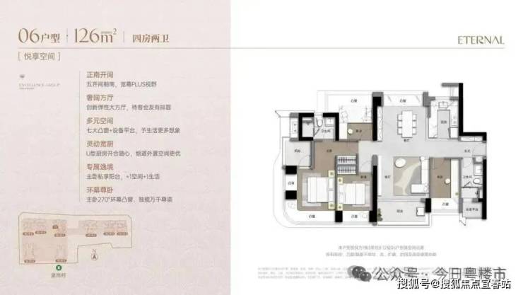 126㎡四房两厅:东南朝向看花园,四房空间格局方正,兼顾舒适性与实用性,适配改善家庭。