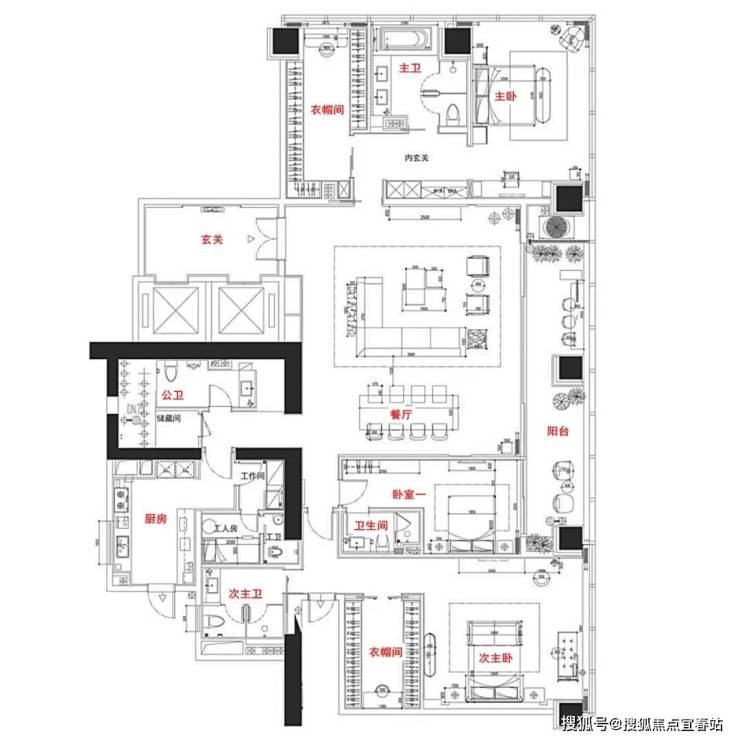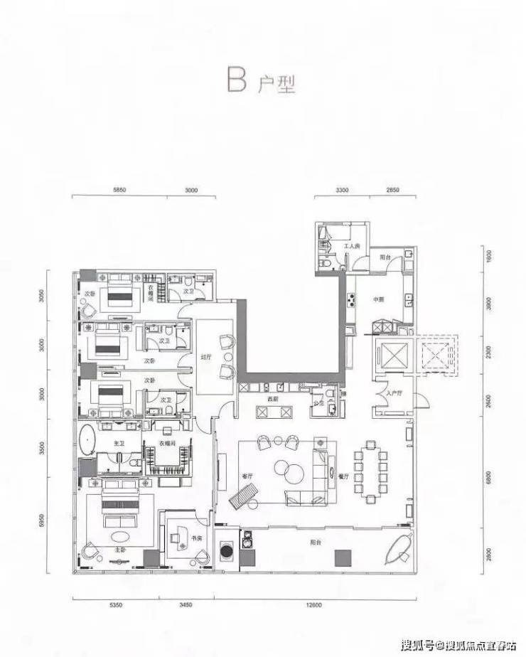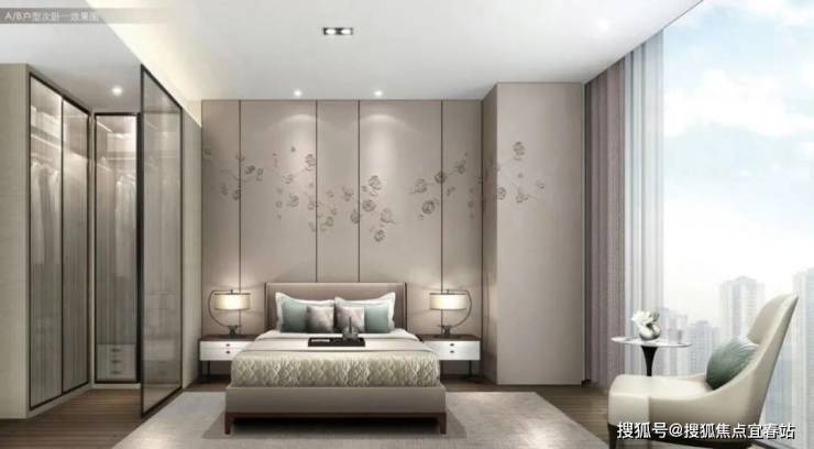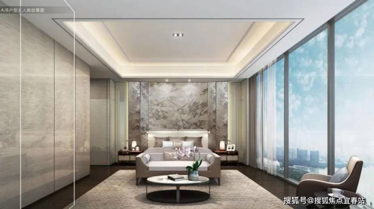 A、B户型,整体是做了动静分离的设计,客餐厅一体化有100平方,中西餐厨设计,有四个套房五卫+1个保姆套房+书房。 270° 环幕主卧+ 全景落地采光玻璃, 给你视觉冲击,独立的衣帽间以及一个三分离主卫,也是特别的奢侈。除此之外朝南三开间自西向东分别是老人房,次卧。老人房和次卧都做了全明飘窗,还有一个干湿分离的卫生间,入门一排衣柜。