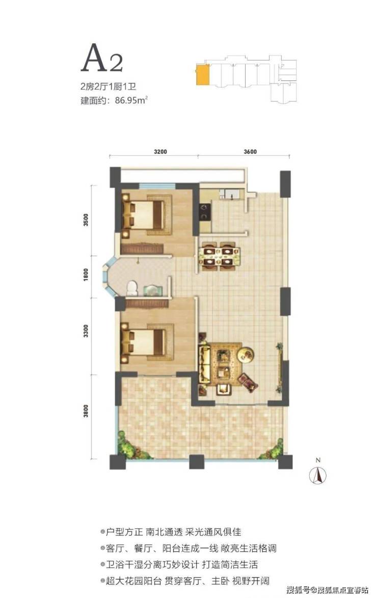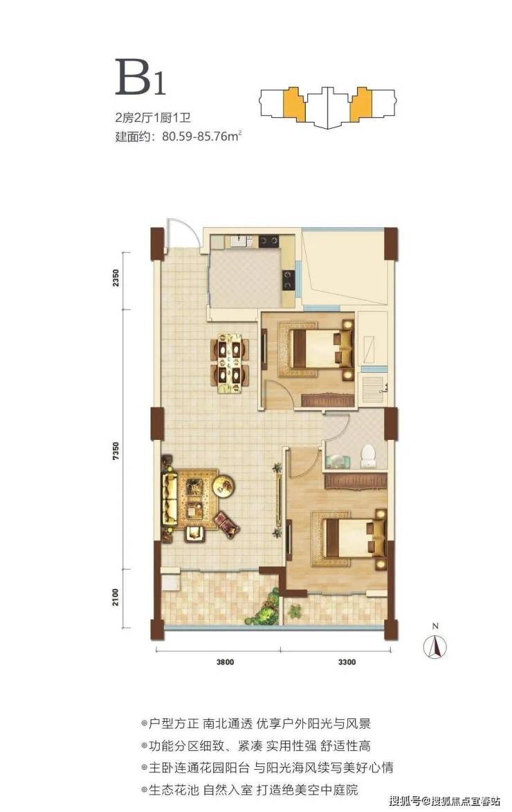 在售户型面积80-88㎡两房,户型方正,南北通透。