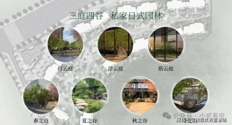 小区园林“四谷三庭”的空间布局,不像传统豪宅园林那样“扁平”,而是非常立体。在这里,项目借助砂、石、水、木等元素,营造山水庭院的禅意。搭配上樱花树等各种花期不同的树木,也算是把“四季”风景搬到小区楼下。
