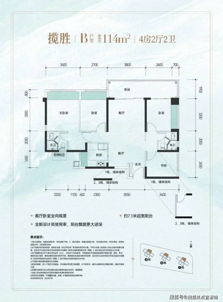 113㎡的4房2厅2卫,设计的是竖厅双龙抱珠格局,进门入户玄关,客厅3.8米的开间,LDKB一体化设计,4个卧室分别做到了主卧17.34㎡/次卧11.07㎡/次卧10.56㎡/次卧9.01㎡(包含墙体飘窗),客厅连接次卧出7米长的观景大阳台,U型厨房,得房率约:81.78%(不含赠送),东北朝向看科学公园。